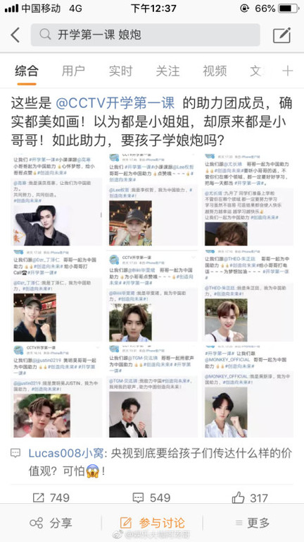 據微博《娛樂大咖阿湯哥》的爆料,央視的教育節目《開學第一課》,主要提供給中小學生觀看,邀請不年輕藝人擔任嘉賓,卻有男藝人的形象引發網友抨擊「確實都美如畫!以為都是小姐姐,卻原來都是小哥哥!如此助力,要孩子學娘炮嗎?」美顏意外引發討論。