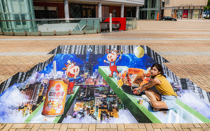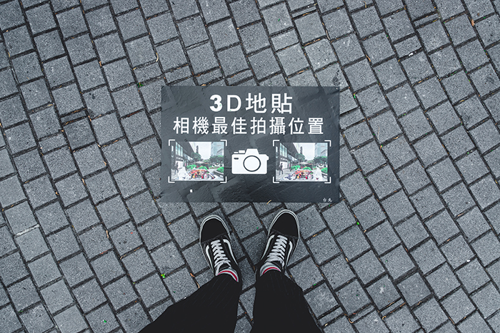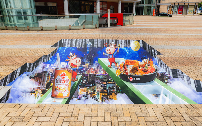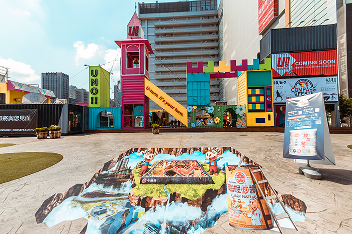 而位於台中UNO市集(台中大遠百旁)的3D地貼圖案則顯得繽紛許多,看到烤肉架懸在一個空島上,拍起照來也多了一點驚險的感覺!
