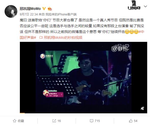 此外,被廖穎軒PK出局的邢凱翔,淘汰後則不斷在微博上批鬥好聲音。7日,邢凱翔就相當不滿謝霆鋒上台為劉郡格伴奏搶票,他發文表示「這是選手之間的較量,如果沒有上台那段演奏,輸了我沒話,但並不是那樣」;此前,7月31日邢凱翔被淘汰的節目片段播出,他直接開嗆同時標記謝霆鋒,並表示「這是什麼賽制,不應該人人平等嗎,這樣的賽制你也妥協,搖滾哪去了。」;隔一個禮拜,他更貼上一張充滿「髒字」諧音的照片,且明指謝霆鋒說到「態度呢?個性呢?磨沒了阿?一天一天搖滾搖滾掛嘴邊的,幹這事有意思嗎?偽搖滾」。