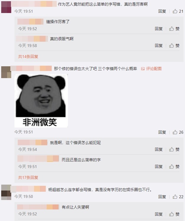 網友們見狀也紛紛留言批評「文盲當道」、「娛樂圈門檻越來越低了,小學畢業都敢進!」、「文化水準太差的明星」,但也有網友給予相當中立的回應「長遠來看,經紀公司應該給她補補一些東西或者把控一下」、「連這麼簡單字都寫錯,是平時應該多看點書籍,充實自己,才是不錯的選擇」、「既然成名了就用現在的資源多讀點書吧,別只顧圈錢,靠顏值總有一天會被取代」希望楊超越可以找機會好好充實自己。