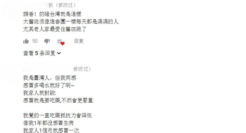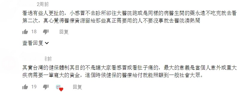 影片上傳後引起網友熱烈討論,許多人分享了身邊的人過度依賴醫生的現象,「大醫院很像進香團一樣每天都是滿滿的人」、「小感冒不去診所卻往大醫院跑、藥永遠不吃完就去看第二次」、「台灣的健保的目的不是讓大家看感冒看肚子痛的,最大的意義是當個人意外或重大疾病需要龐大的資金時,能協助給付。」