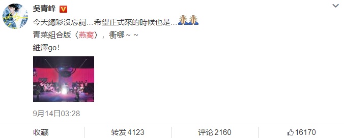 其中,星推官吳青峰難得開金嗓,與自己的賽道選手蔡維澤一同演出《燕窩》,更在微博上連發兩條訊息表達自己的相當期待在舞臺上「青蔡合體」心情,而在正式演唱時,兩人也合作無間,點燃全場,更將蘇打綠歌曲《你在煩惱什麼》加入其中,清澈嗓音令人陶醉。