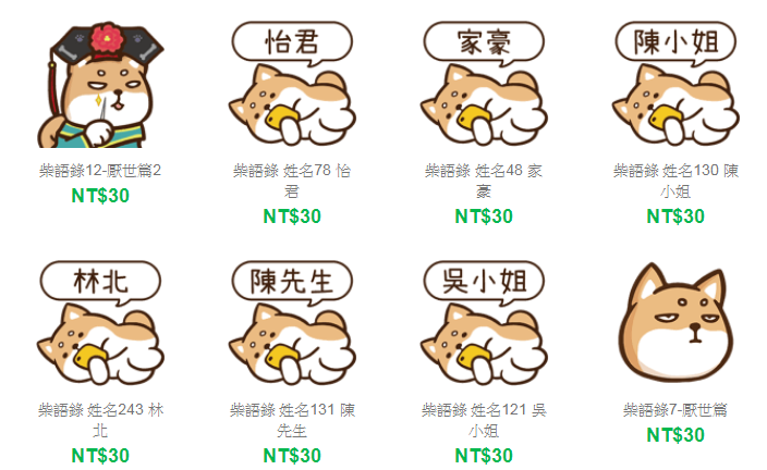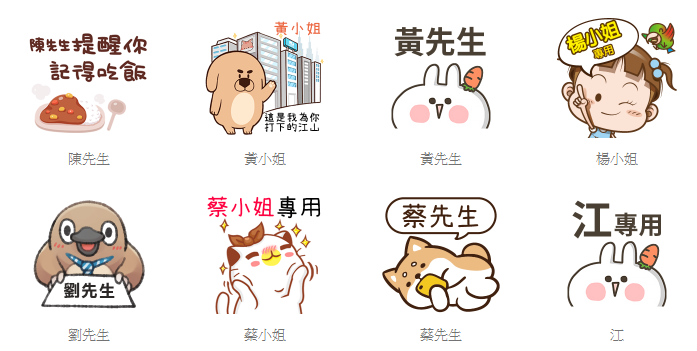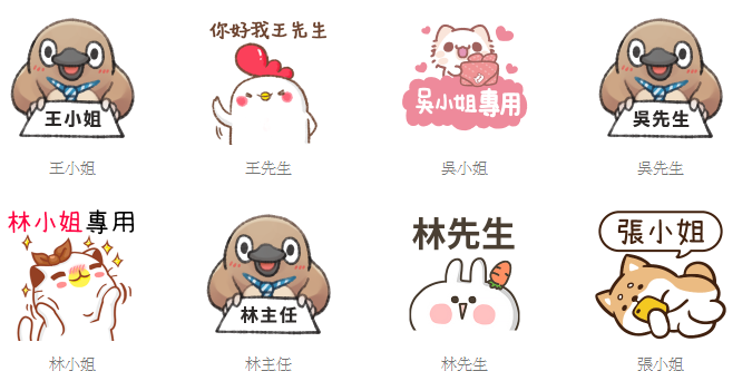 當中也有姓氏的專屬貼圖,「吳小姐專用」、「陳先生提醒你記得吃飯」、「你好我葉」等可愛貼圖和語錄令人莞爾一笑,暱稱貼圖如:「老大」、「北鼻」、「豬豬」更是情侶調情必備的撩妹/哥小物。