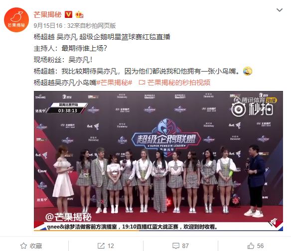 一年一度的企鵝籃球名人賽自2016年開辦,參加成員包括籃球明星和娛樂藝人,其中吳亦凡已連續參與三屆。15日,火箭少女出席籃球名人賽紅毯直播現場時,記者問到「最期待哪位嘉賓」,楊超越回應吳亦凡,並心直口快的解釋「因為他跟我一樣有小鳥嘴」,甚至現場做出噘嘴動作。