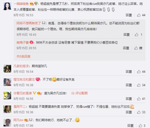 此番言論,引起網友正反論戰。有人認為「不要蹭吳亦凡的熱度」、「怎麼敢diss前輩」;另有一派解釋當時非常多吳亦凡的粉絲再呼喊他的名字,所以楊超越才會順口說出吳亦凡,並表示「楊超越也很期待前輩,才順說一句」、「他沒想那麼多,就隨口說一句而已」。
