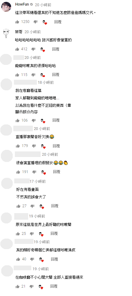 影片上傳之後,網友也紛紛留言:「癡癡咳嗽真的很煩哈哈哈」、「直播那裏聲音好欠揍」、「很會演直播理的假掰女」、「王美你怎麼一直在翻白眼啊」、「好在有看畫面 不然真的誤會大了」、「這集意外地令人感到超煩躁」,就連HowHow和蔡哥也回覆:「這沒帶耳機看還真的不知道怎麼跟爸爸媽媽交代」、「哈哈哈哈哈哈哈 謎片感好像蠻重的」,而痴痴也搞笑回覆:「哎喲 沒有啦 就是..我卡痰啦 嗯嗯 嗯」。