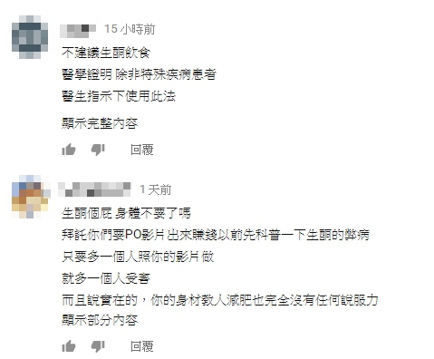 影片一曝光後不少網友紛紛質疑生酮飲食,憤怒地抨擊古娃娃,認為不該推崇這項垃圾減肥方法,「公信力零」、「生酮根本沒有用而且不健康,長期這樣吃會造成酮酸中毒,反而傷身」、「拜託要PO影片出來賺錢以前先查一下生酮的弊病,只要多一個人照你的影片做,就多一個人受害,而且說實在的,你的身材教人減肥也完全沒有任何說服力。」