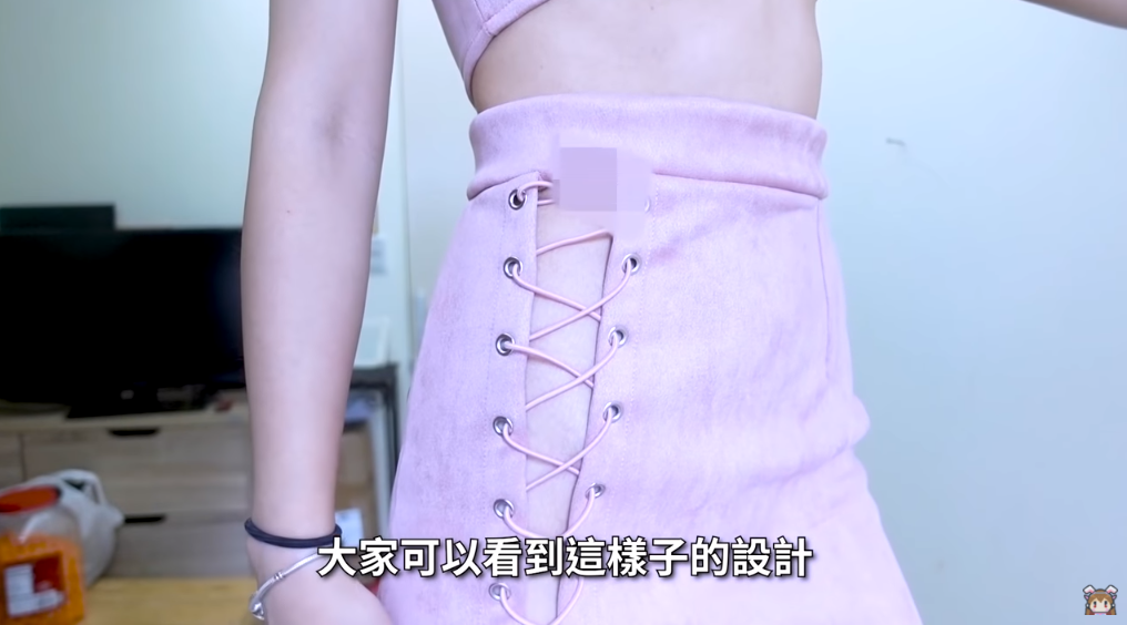15日咪妃上傳的新影片中,咪妃久違的做了淘寶開箱主題,更在鏡頭前大方試穿給粉絲看!不過特別的是其中有一套粉色套裝卻讓咪妃驚呼:「不能穿內褲」!只見這件套裝上身是平口的小可愛,下半身則是貼身的短裙,特別的是右邊竟然直接縷空,讓肌膚完全暴露在外,咪妃也表示:「裙子部份的設計真的有夠猛,裡面如果有穿內褲的話,一定會露出來」。
