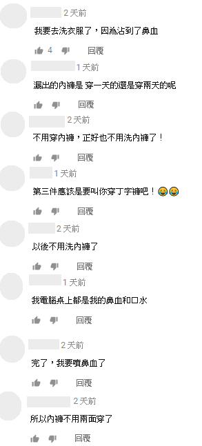 影片發布之後:「咪妃不洗內褲的」、「你不是那個內褲穿很多天的嗎」、「咪妃不管怎麼穿都很好看」、「我要去洗衣服了,因為沾到了鼻血」、「漏出的內褲是 穿一天的還是穿兩天的呢」、「不用穿內褲,正好也不用洗內褲了!」、「以後不用洗內褲了」、「我電腦桌上都是我的鼻血和口水」。