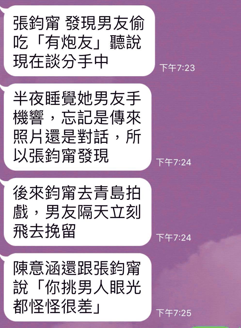 根據《鏡周刊》報導,有網友爆料張鈞甯抓包男友劈腿,並且怒提分手!據了解張鈞甯當時半夜發現男友手機傳來簡訊,內容更相當露骨、曖昧,怎料當她質問男方之後,男方竟表示「只是炮友」,讓張鈞甯一氣之下便提出分手。而隔天她去青島拍戲,男友也飛去挽留,相當狗血。消息還指出張鈞甯的好友陳意涵聽聞此事之後也表示:「你挑男人眼光都怪怪很差」。