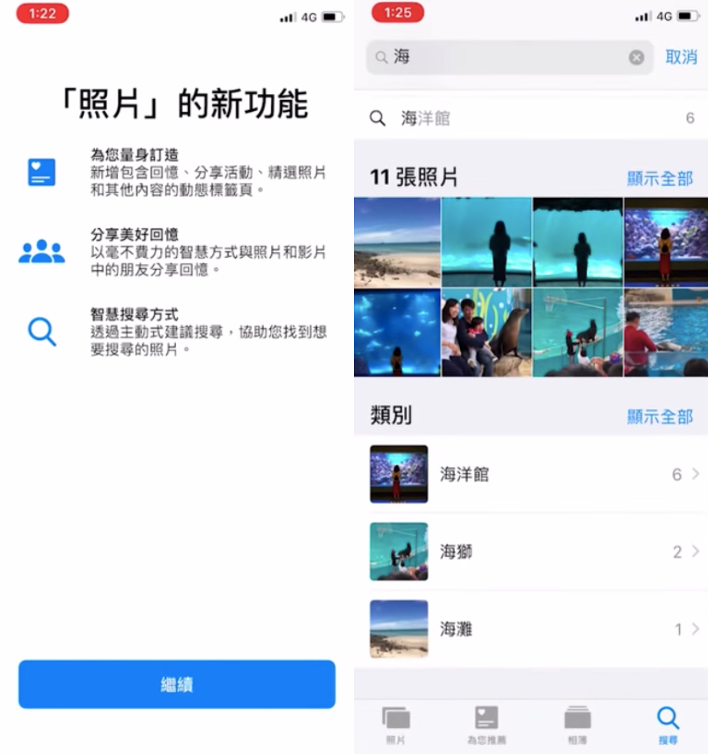 過去,如果我們要找特定照片,都得在相簿中上下滑動、翻找,但更新iOS 12後,相簿裡多了一個「搜尋」的功能。它會自動分辨相片中的物件、時間、國家…,當你輸入關鍵字時,就會出現有該物件的照片,老實說,這真的是還蠻方便的呢!