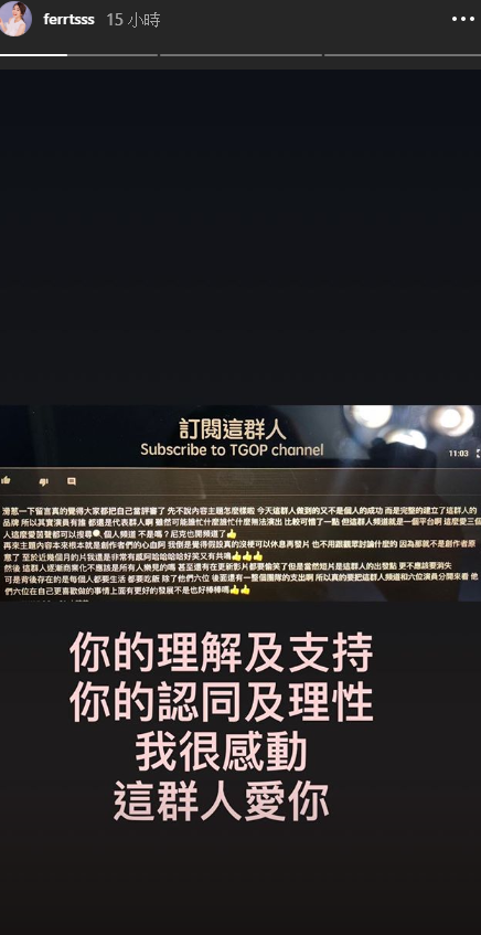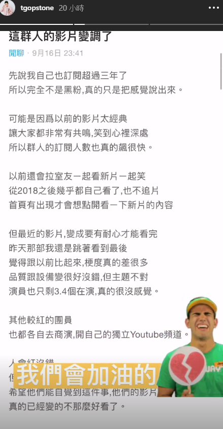 不僅如此,也有網友在Dcard發文表示「這群人的影片變調了」,更直言「覺得跟以前比起來,梗度真的差很多」、「演員也只剩3.4個在演,真的很沒感覺」。如此種種的質疑也讓這群人許多成員透過IG限時動態回覆,只見茵聲、展瑞貼上粉絲的留言,謝謝願意理解體諒的粉絲:「你的理解與支持,你的認同和支持,我很感動,這群人愛你」、「反正還是會繼續努力,不要放棄治療啊群人」,而石頭也貼上Dcard的文章,並表示:「我們會加油的」。