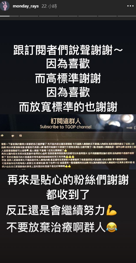 除了茵聲、展瑞、石頭之外,木星和董仔也轉發了同一則留言截圖,並且表示會繼續努力,也希望這群人之後能在大給大家有共鳴的作品。