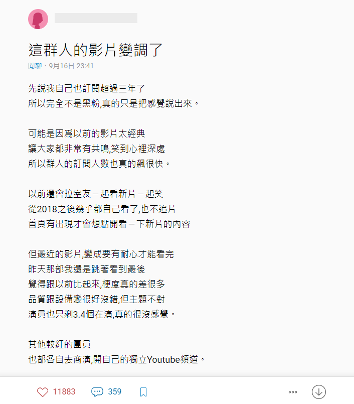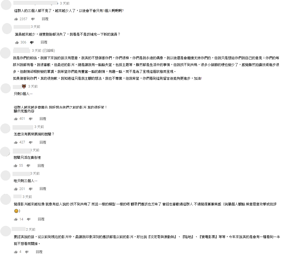 只見網友紛紛留言:「這群人的三個人都不見了,越來越少人了,以後會不會只有1個人啊啊啊?」、「演員越來越少,連雙胞胎都消失了」、「最近的影片,總是讓我有一點點失望」、「你們的影片越來越不好笑」、「影片內容卻越來越冗」、「我好想念他們之前的影片 真的很好笑!」。