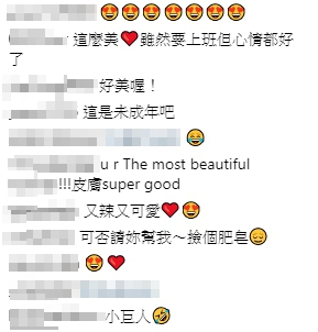 火辣照一曝光後,所有網友紛紛跪倒在地,驚呼:「讓人精神為之一振」、「你站在路口會造成交通堵塞啦」、「這未成年吧」、「被美醒了」、「美到耀眼」,還有網友開玩笑地說「可以幫我剪肥皂嗎」。