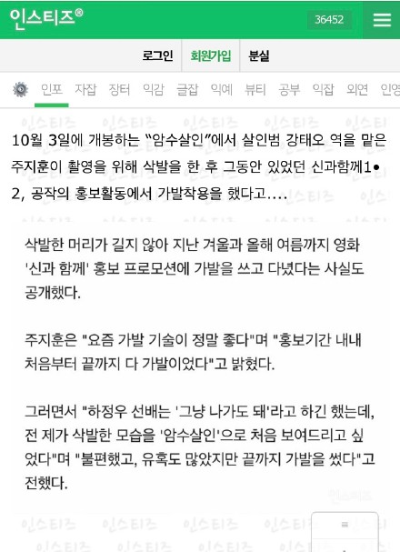 朱智勳透露,去年12月《與神同行》第一集上映宣傳到今年8月左右都是戴著「假髮」跑活動。朱智勳表示,去年8月他接拍電影《暗數殺人》,為配合劇中角色殺人魔的凶狠形象,他不惜犧牲剃平頭,而該部電影也將在10月於韓國搶先上映。
