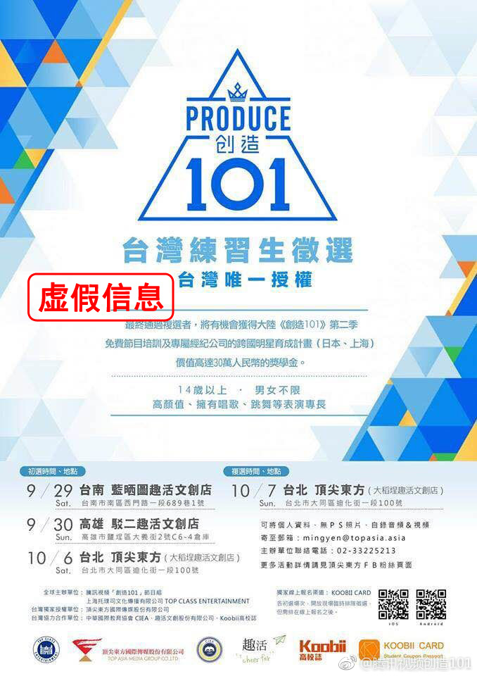 近日,網路上廣為流傳的「台灣練習生徵選」海報,內容指出《創造101》第二季主辦單位就是騰訊,更標明由「頂尖東方傳媒」得到「台灣唯一授權」,看起來煞有其事。海報中指出,練習生將通過初選、複選兩階段,通過複選的人就能到大陸參與節目培訓,接著更有「跨國明星培育計畫」另不少有明星夢的年輕人相當動心。