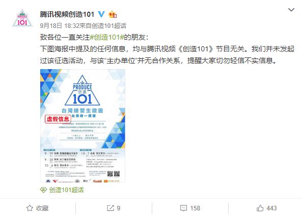 18日,《創造101》元製作公司騰訊正式出面闢謠,直接和台灣公司劃清界線。聲明中顯示,「我們並未發起該徵選活動,與該『主辦單位』無合作關係」提醒大家不要被騙了,而港沒也指出,這類的冒名海選活動已經不是第一次,要求外界要小心謹慎。