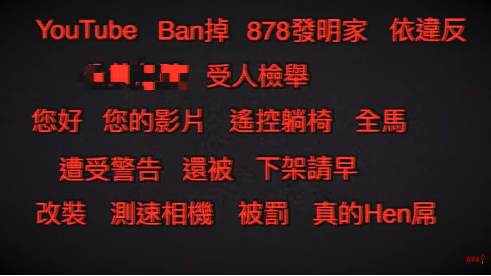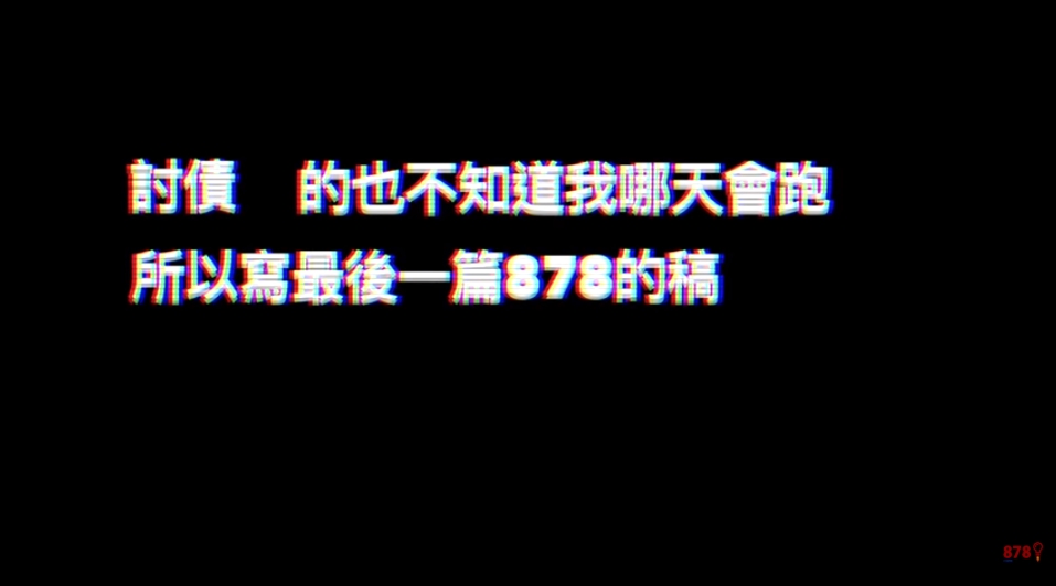 20日878發明家上傳新影片「878發明家遭討債追殺!竟做出這樣的決定?!」用Rap的方式吐露出他的近況。歌詞中唱到「眾人皆跟隨著流行,沒人在修行,獨自一條路,造出獨一無二的視頻」描述他一路以來的創作歷程,接著又提到「沒日沒夜爆肝發明,只為了短短的87影片發明,卻得來這樣的消息」,畫面便開始顯示「878發明家、您好、您的影片受人檢舉」等字眼疑似影片被youtube要求下架,接著他又提及「繳不完的罰單她媽要我怎麼搞」,並說「人終究有天會倒,就像馬子有天會跑,每天寫稿,討債的也不知道我哪天會跑,所以寫最後一篇878的稿」最後就出現一段878發明家拿著背上背包拿著一個小箱子逃跑的畫面,全片結束。