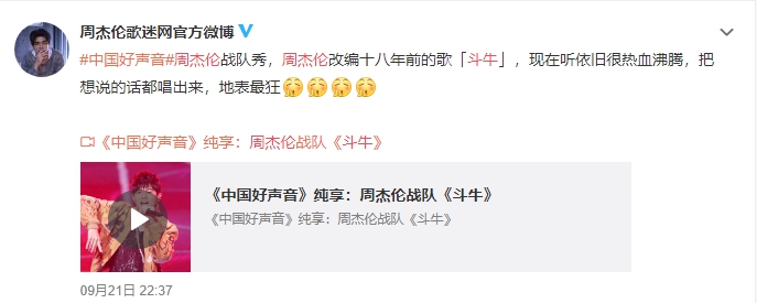 《中國好聲音》是一檔在大陸非常火紅的歌唱選秀節目,捧紅了許多素人,在最新一期的節目當中,14進7第一場,開場就由謝霆鋒攜隊員重現《光輝歲月》,周杰倫帶隊改編《鬥牛》,歌詞加入對手戰隊名稱,進一步激發了戰隊間濃濃的火藥味。