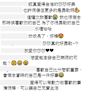 貼文發布之後,許多網友引起許多網友紛紛留言:「也許很傻但更多的是勇敢啊」、「認真覺得自信的莎莎好美」、「覺得胖莎棒棒的 保持當初那份傻勁。」、「其實莎莎你很成熟!」、「妳成長了,好棒」、「照片好時尚,文好感性」、「莎莎真的好勇敢」、「我愛你莎莎」、「喜歡自己比什麼都重要,會懷念當時的自己是一件好事」。