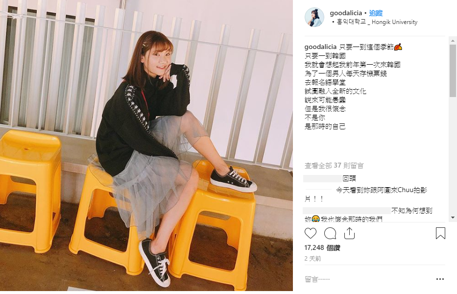 近日愛莉莎莎在IG發文,文中她提到:「只要一到這個季節,只要一到韓國,我就會想起我前年第一次來韓國,為了一個男人每天存機票錢」,意外揭露當時是為了一個男人,不過對象到底是誰,她卻沒有明說!愛莉莎莎接著回憶起自己當時前往韓國的歷程,也感觸地打下:「試圖融入全新的文化,說來可能愚蠢,但是我很懷念,不是你,是那時的自己」。