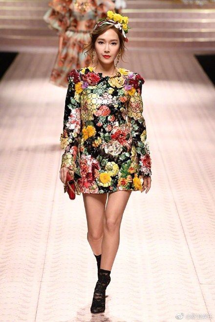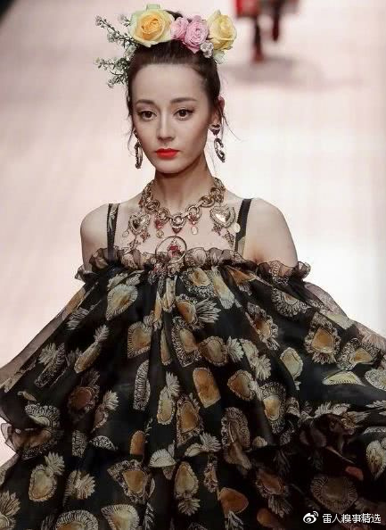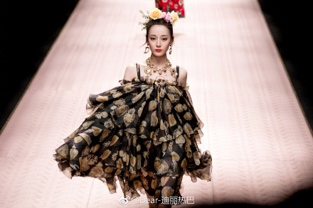 照片中,迪麗熱巴身穿黑色短洋裝,層層薄紗走起路來相當飄逸,脖子上戴的金項鍊相當華麗,由多個圓環綴飾而成,而頭上也頂著粉色花朵,細長的雙腿的走在T台相當吸睛。