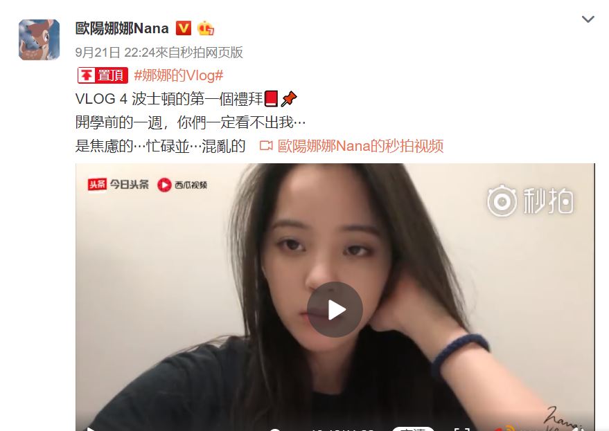 當天晚上,歐陽娜娜馬上就和粉絲分享她在開學前一周出門的影片,包括她參與「Ralph Lauren」的時裝秀,以及分享伯克立的校服等,不過貼文中卻透露心情,並說到「你們一定看不出我,是焦慮、忙碌並混亂的。」網友貼心回應,「忙碌的你還是無時無刻紀錄一切分享給我們,愛你」。