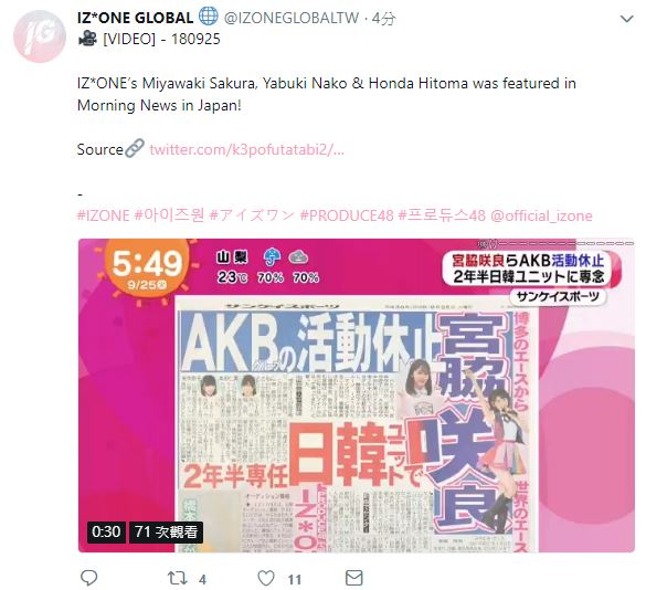 韓國女團選秀節目《Produce 101》這次由韓國Mnet旗下練習生和日本AKB48團體成員一同競爭出道機會,最終組成12人的「IZ*ONE」出道。該團體中有3位日籍成員宮脇咲良、矢吹奈子和本田仁美,原先外界都認為日本成員會兼顧AKB在日活動以及IZ*ONE,沒想到24日下午,IZ*ONE經紀公司突然宣布,3人會停止AKB48所有活動,專心發展在韓國的演藝事業,令外界相當震驚。