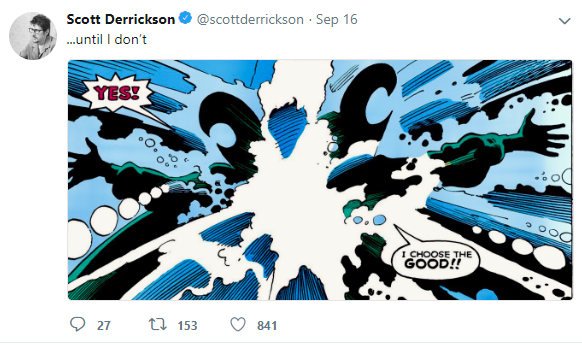 《奇異博士》導演史考特德瑞森先於9月16日先在推特PO了1977年原著漫畫《What If》第18集中一張照片,而畫面當中僅出現一句對白:「我選擇好的那一面」(I choose the good),又在PO文寫下「直到我不這樣」(until I don't)。
