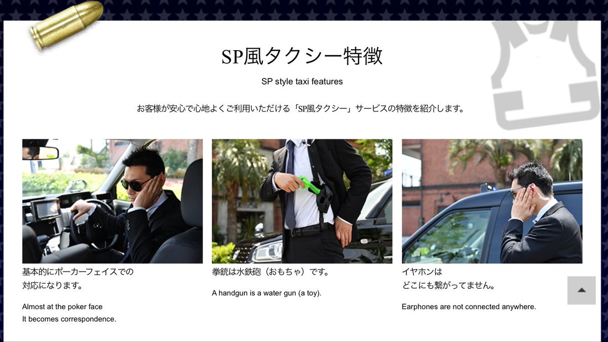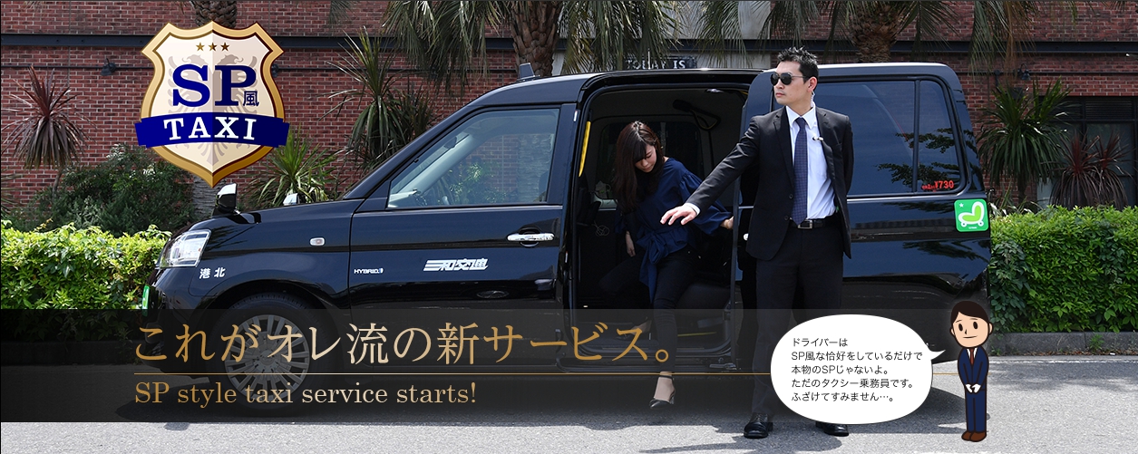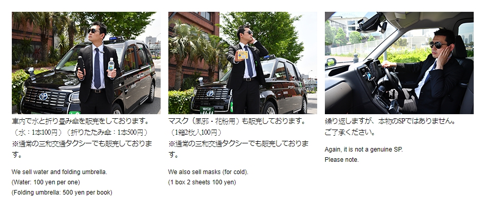 無論你是什麼身分,只要向日本三和交通租車公司預約了這一項「SP風タクシー」服務,就會有一個穿著整套西裝、戴著墨鏡的保鑣行司機開著像是保母車一般的計程車來接送你,最酷的是當你上下車時,這位司機都會「演技大開」假裝在使用對講機、甚至做出隨時要掏槍的動作嚴密保護你的人身安全,路人一看到肯定會誤以為你是哪位超級大名人或有錢人。