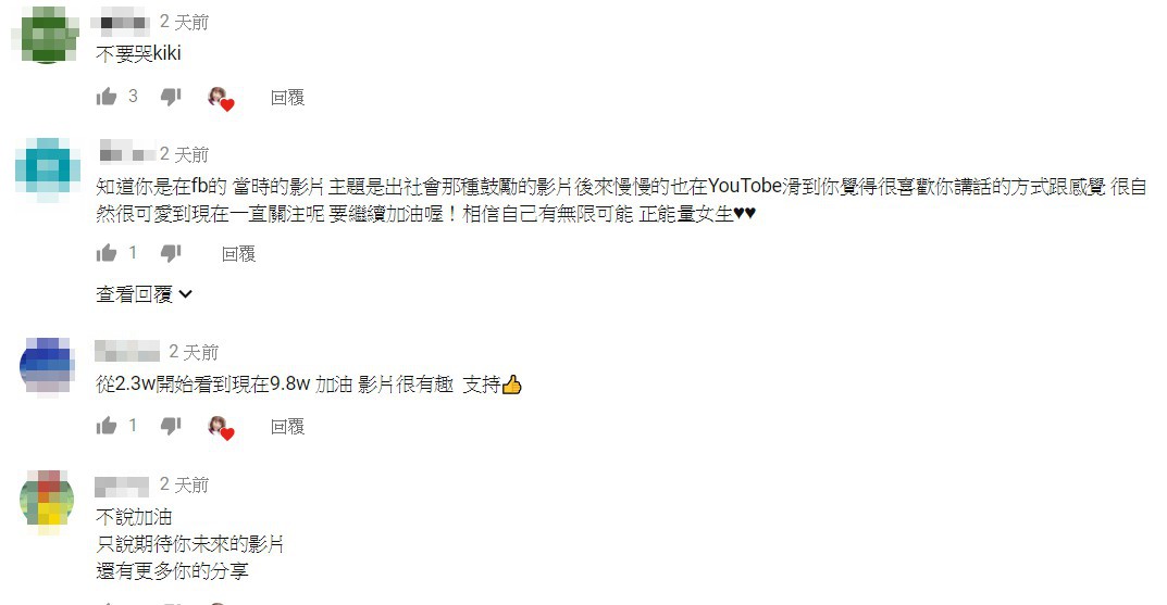 影片的最後,她也感謝正在看著影片的粉絲,也希望粉絲可以一直陪著她走下去。影片下方的留言也很多網友暖心的支持她,更有人要她不要哭,也很多人表示從很早之前就一直支持她了要她繼續加油。