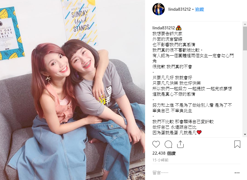 琳妲昨日透過IG發文,只見文中她針對許多粉絲提出的質疑做出回應,「外面的流言蜚語 ,也不影響我們的真感情,我們真的很不喜歡被比較」,她更表示有許多人都認為一個團體中兩個女生一定會勾心鬥角,不過兩人是「真的不會」!