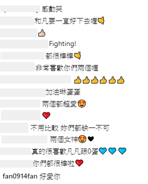 此外琳妲也順勢和凡凡告白:「只要凡凡好 我就會好,只要凡凡快樂 我也好快樂」,姊妹情深相當溫馨!而許多網友也紛紛留言:「反骨女孩就是讚」、「好棒棒」、「真的很喜歡凡凡跟0蛋」、「好感動喔嗚嗚 這就是所謂的真感情」、「你們好可愛可愛到不行」、「我真心覺得妳們雙姝真的很棒」、「這就是我要的~蛋凡」,而凡凡也在下方回應:「好愛你」。