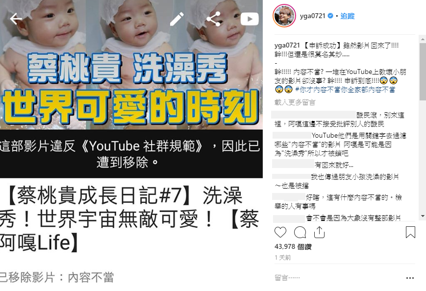 蔡阿嘎昨日透過IG發文,只見他暴怒表示:「X!!!!! 內容不當? 一堆在YouTube上教壞小朋友的影片卻沒事? X!!!! 申訴到底!!!!」,更在hashtag中打上「你才內容不當你全家都內容不當」,因為愛子心切,兒子可愛的洗澡影片卻被下架讓他相當生氣,不過好在蔡阿嘎提出申訴之後,影片便順利回來了,然而蔡阿嘎仍表示:「X!!!但還是很莫名其妙.....」。