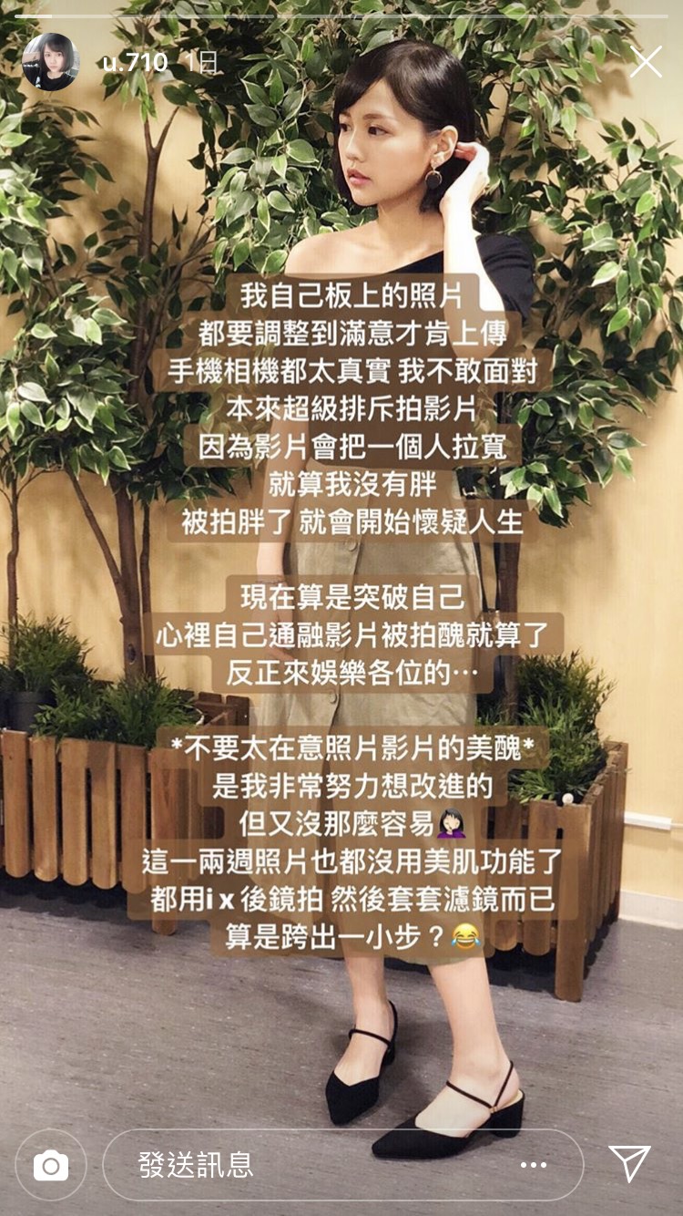 許瑜26日透過IG限時動態發文,表示「我自己版上的照片,都要調整到滿意才肯上傳」,許瑜說明因為手機和相機的照片都太真實,所以「不太敢面對」,她更透露:「本來超級排斥拍影片,因為影片會把一個人拉寬,就算我沒有胖,被拍胖了,我就會開始懷疑人生」。
