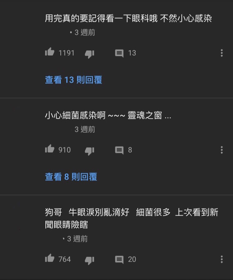 不過,比起恐怖傳說,網友更關心牛眼淚的衛生疑慮,紛紛在影片底下留言:「用完記得要看眼科」、「小心細菌感染啊」、「牛眼淚別亂滴...上次看新聞說眼睛險瞎」。儘管王狗還沒回應粉絲,不過根據眼科醫師所述,牛的眼淚畢竟是體液的一種,沒有經過萃取分離或專人驗證就貿然使用,有可能導致角膜潰傷,的確更需要注意衛生安全。