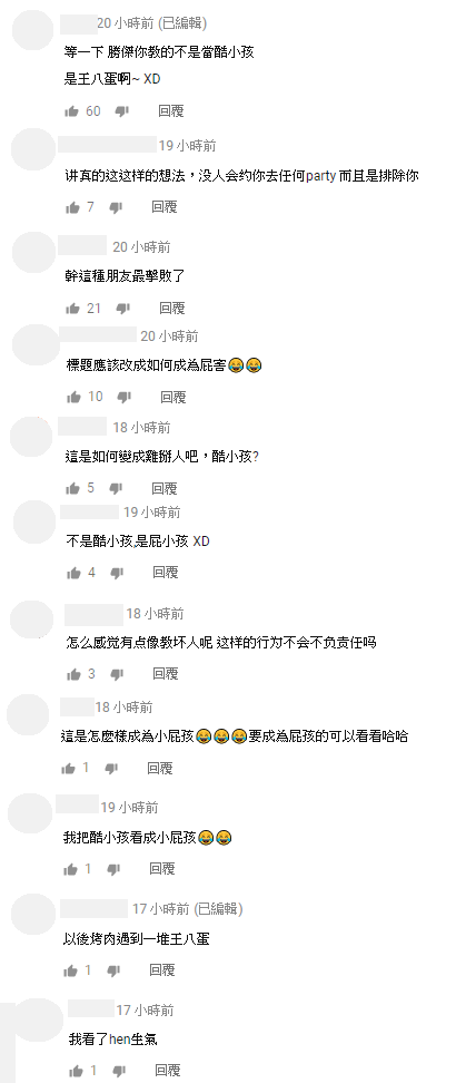 不過影片後段聖結石也坦承自己完全在亂說,並搞笑直說:「以後就不會有人找你烤肉,因為酷小孩都是孤獨、寂寞、邊緣」,而影片上傳之後,網友也紛紛留言:「勝傑你教的不是當酷小孩 是王八蛋啊」、「我感覺要改成小屁孩」、「標題應該改成如何成為屁孩」、「不是酷小孩,是屁小孩」、「完美的邊緣人培養計劃」。