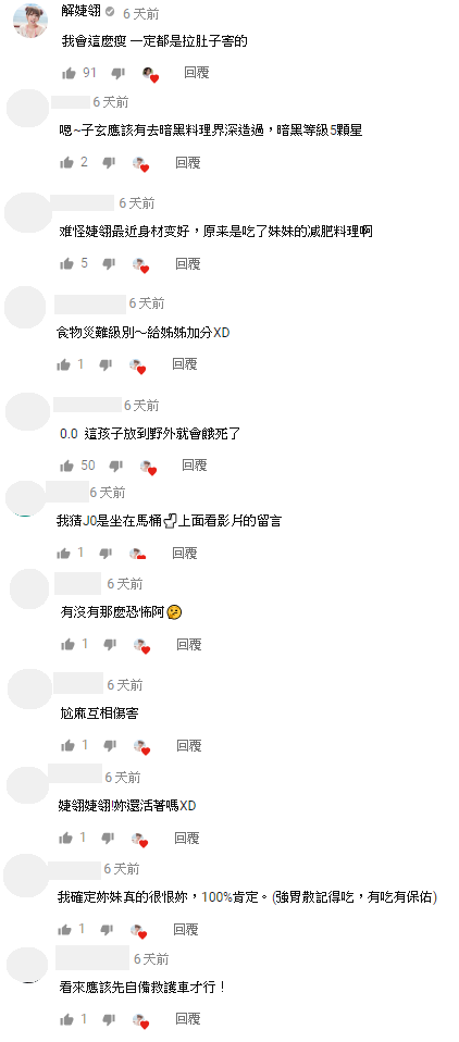 影片po出之後,許多網友紛紛留言:「嗯~子玄應該有去暗黑料理界深造過,暗黑等級5顆星」、「這孩子放到野外就會餓死了」、「妹妹是不是會把廚房燒掉 !!」、「食物災難級別~給姊姊加分XD」、「我猜J0是坐在馬桶上面看影片的留言」、「我想婕翎的心在子玄的愛心料理翻面前,就已經先支離破碎了」、「這暗黑料理還好我們觀眾沒吃到~不然廁所裡面絕對爆滿」、「看來應該先自備救護車才行」。