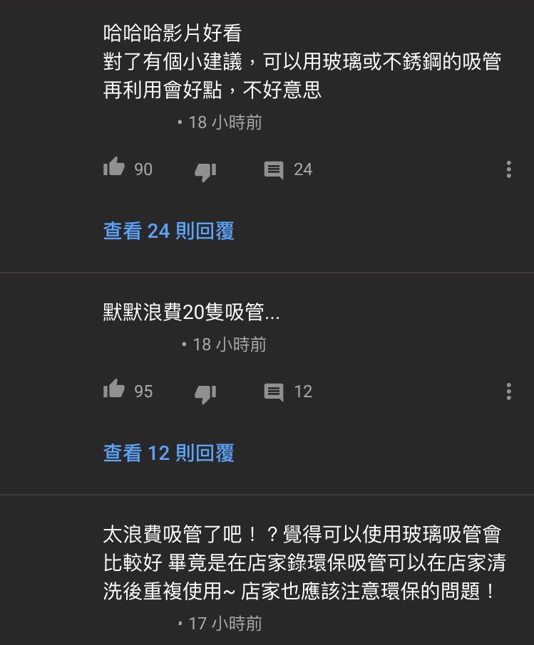 針對九妹影片中,為了試喝飲料用掉20根吸管,網友紛紛在底下留言:「太浪費了吧」、「建議使用玻璃或不鏽鋼吸管」、「默默浪費20隻吸管......」、「店家也應該注意環保的問題!」。