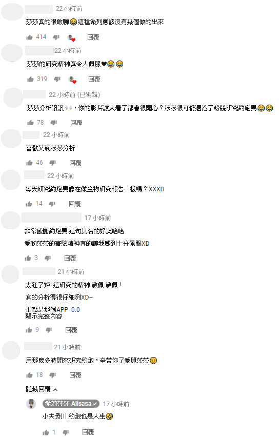 只見影片發布之後,網友紛紛留言:「敬佩妳的研究家精神」、「莎莎的研究精神真令人佩服」、「莎莎真的很敢聊」、「莎莎分析讚讚,你的影片讓人看了都會很開心?莎莎很可愛還為了粉絲研究約砲男」、「喜歡愛莉莎莎分析」、「用那麼多時間來研究約炮,辛苦你了愛麗莎莎」、「每天研究約炮男像在做生物研究報告一樣嗎」、「愛莉莎莎的實驗精神真的讓我感到十分佩服」。