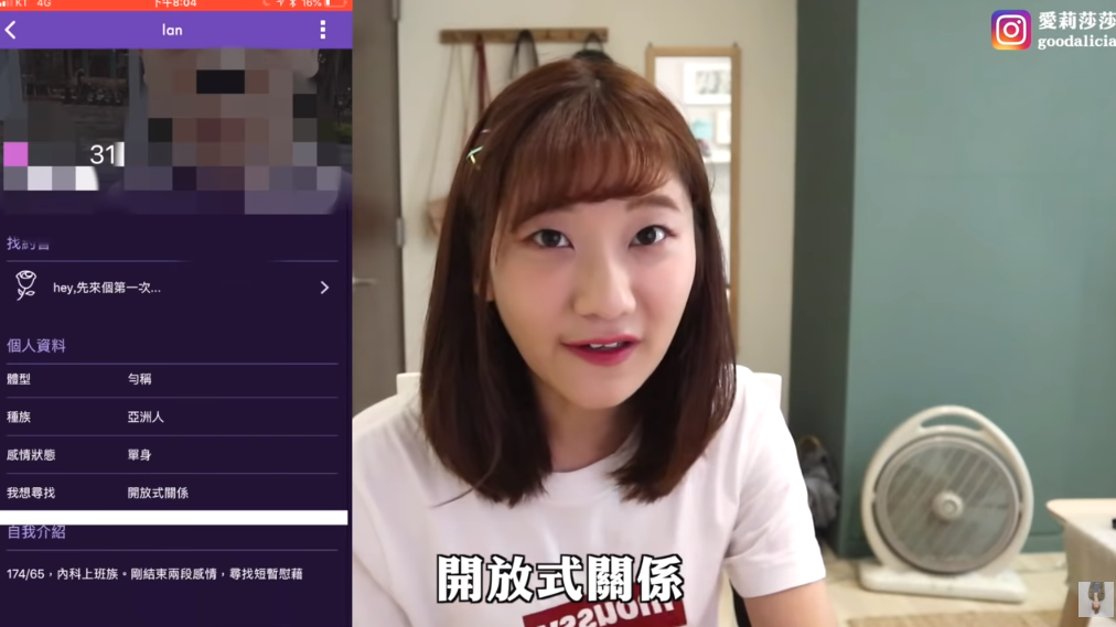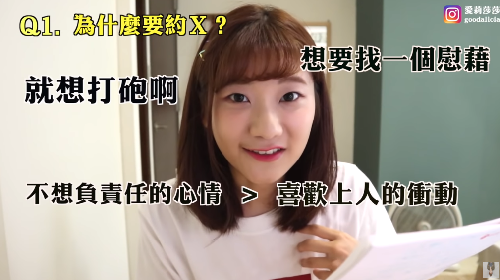 愛莉莎莎27日推出新影片,其中她表示常常收到粉絲詢問關於「約炮男」的問題,讓她決定親自研究!只見她立刻下載了約炮軟體,除了在APP忠和有約過炮的男生聊天、了解他們的想法之外,她更約出三位約炮男做訪問,相當大膽!而愛莉莎莎也說明在約炮軟體中,許多人都會直接表明尋找「開放式關係」,也就是約炮的意思!
