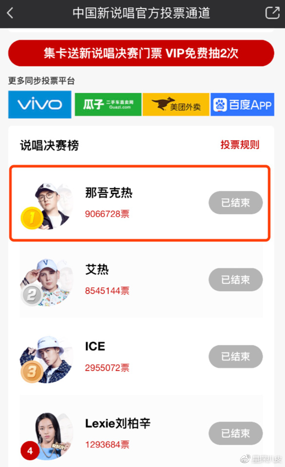 大陸熱播嘻哈選秀節目《中國新說唱》進入尾聲,上周由選手艾熱五連勝取得復活名額,將與那吾克熱、 ICE及劉柏辛在全國總決賽中一決高下,本周9月29日的最新一集中由《中國新說唱》巔峰TOP榜年度金曲前5名歌手及戰隊導師們輪番演唱帶來一首又一首的好歌,選手們也使出全力為自己拉票,節目相當精彩。