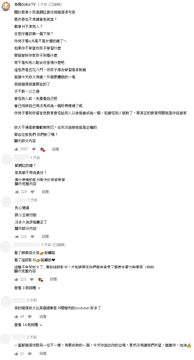 影片上傳之後有許多網友紛紛留言支持放火,就連知名網紅「烏鴉」也在下方留言表示贊同放火所說!而其他網友也紛紛留言希望放火可以跟小玉做切割,不過放火對此則沒有回應。