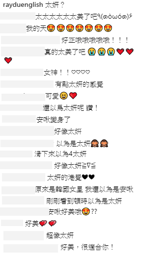 只見許多網友紛紛留言:「女神降臨」、「太美了」、「安啾好正哦~」、「安啾女神啊啊啊啊」、「超美的!!!!」、「有點太妍的感覺」、「有像欸!!!安啾超級正」、「我也有看女神降臨,安啾變好成熟哦!」、「還以爲太妍呢」、「哇另一個安啾∼」、「滑下來以為4太妍」、「好像太妍」。就連阿滴都留言驚呼:「太研?」。