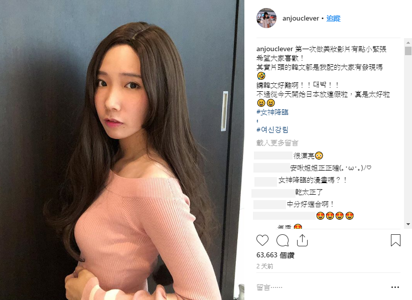 不過大家還是將焦點放在安啾完妝之後,只見她戴上長捲假髮,與平時便差異甚大,加上一字領的貼身粉色毛衣,露出鎖骨及香肩,而在IG中她也放上自己的半身照片,照片中因為毛衣非常貼身,讓她的側邊胸型一覽無遺,性感指數飆升!