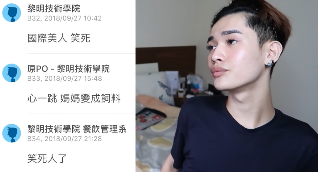 除此之外,他更秀出自己25日被同學偷拍PO在Dcard的文章,其中的留言更是相當不尊重,不僅打上:「國際美人,笑死」、「心一跳,媽媽變成飼料」、「笑死人了」,遭到言語霸凌!對此鍾明軒則表示「好在我抗壓性強,不跟你們計較」,不過對於許多同學的一舉一動他都看在眼裡!然而他仍然氣不過直呼:「我們學校婊子非常多」。