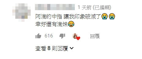 影片下方也有眾多網友們前來留言,有人說:「阿滴的中指,讓我印象破滅了(哭),幸好還有滴妹!」隨後許多網友也抱著相同想法附和:「+1」、「真的!」、「+1嗚嗚嚇到了」、「突然很接地氣」,但也有人替阿滴說話覺得阿滴這樣很真實沒什麼不好!更多的是稱讚阿滴穿韓服很帥,例如:「阿滴怎麼可以這麼帥啊啊啊啊~」、「喔喔喔阿滴很有喔~好帥 真的很韓劇」、「阿滴超帥」等諸多讚美。
