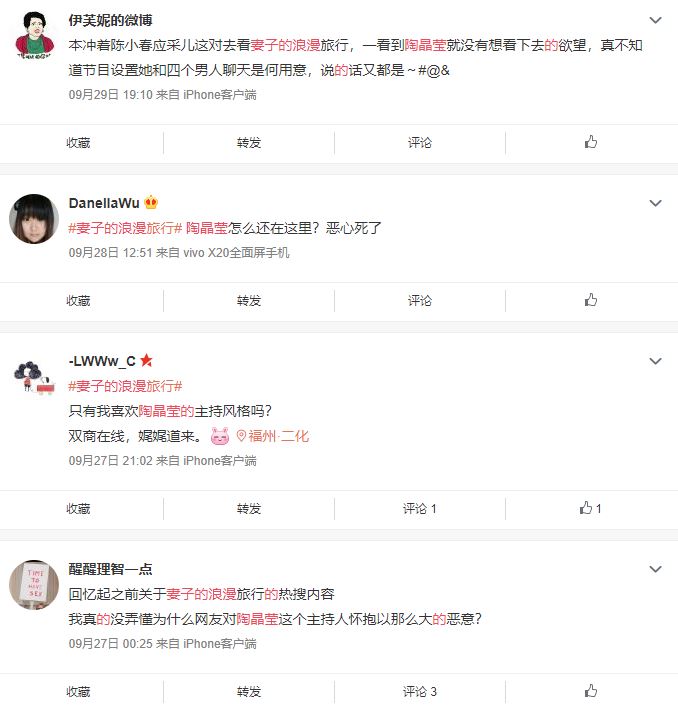 大陸討論度極高的夫妻觀察節目《妻子的浪漫旅行》,節目畫面分為棚內丈夫團和外景妻子團,其中由主持人陶晶瑩作為節目討論主題的發起者,開播以來明星夫妻的私下趣事,非常引人入勝。不過,大陸網友似乎不埋單陶晶瑩的主持風格,甚至有傳言,陶晶瑩可能會丟掉主持棒。