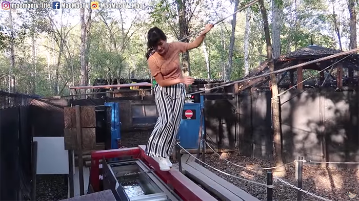 不過後來Mao則了最危險的區域,該區入口強調因為園區中有諸多危險動物,所以一定要簽「生死狀」,不簽「生死狀」便不得進入,讓Mao在進入前便十分膽顫心驚。進入後她首先遇到臭鼬及豪豬,也因為完全沒有柵欄阻隔,Mao相當害怕,尤其食人魚的區域中,需要在食人魚上方踩著類似獨木橋的通道走過,更讓她崩潰直呼:「我都已經腿軟了」。